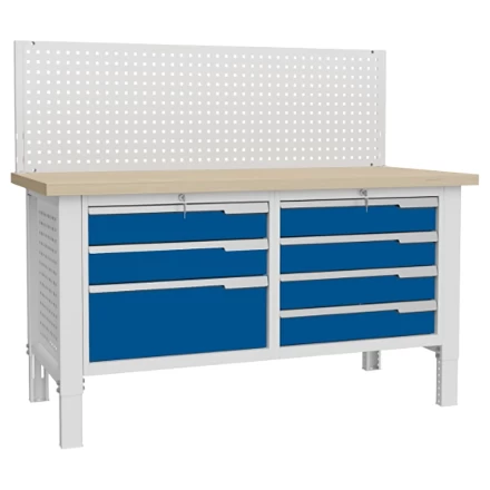 Распределенная нагрузка на рабочую поверхность 1500 кг.Рама верстака выполнена из профилированной холоднокатаной стали толщиной 2 мм. Столешница изготавливается из шлифованной влагостойкой фанеры марки ФСФ толщиной 40 мм, которая покрыта лаком-антисептиком. Усиление столешницы - опорная балка.Для удобства сборки модулей и рамы со столешницей в последней установлены резьбовые футорки. Фактическая глубина столешница 747 мм.Вместительность и вариативность