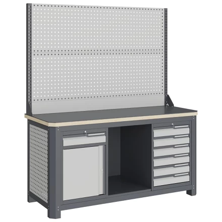 - экран (перфорированная панель) верстака выполнен с квадратной перфорацией 12х12 мм с шагом 38 мм для установки крючков, держателей и других аксессуаров;